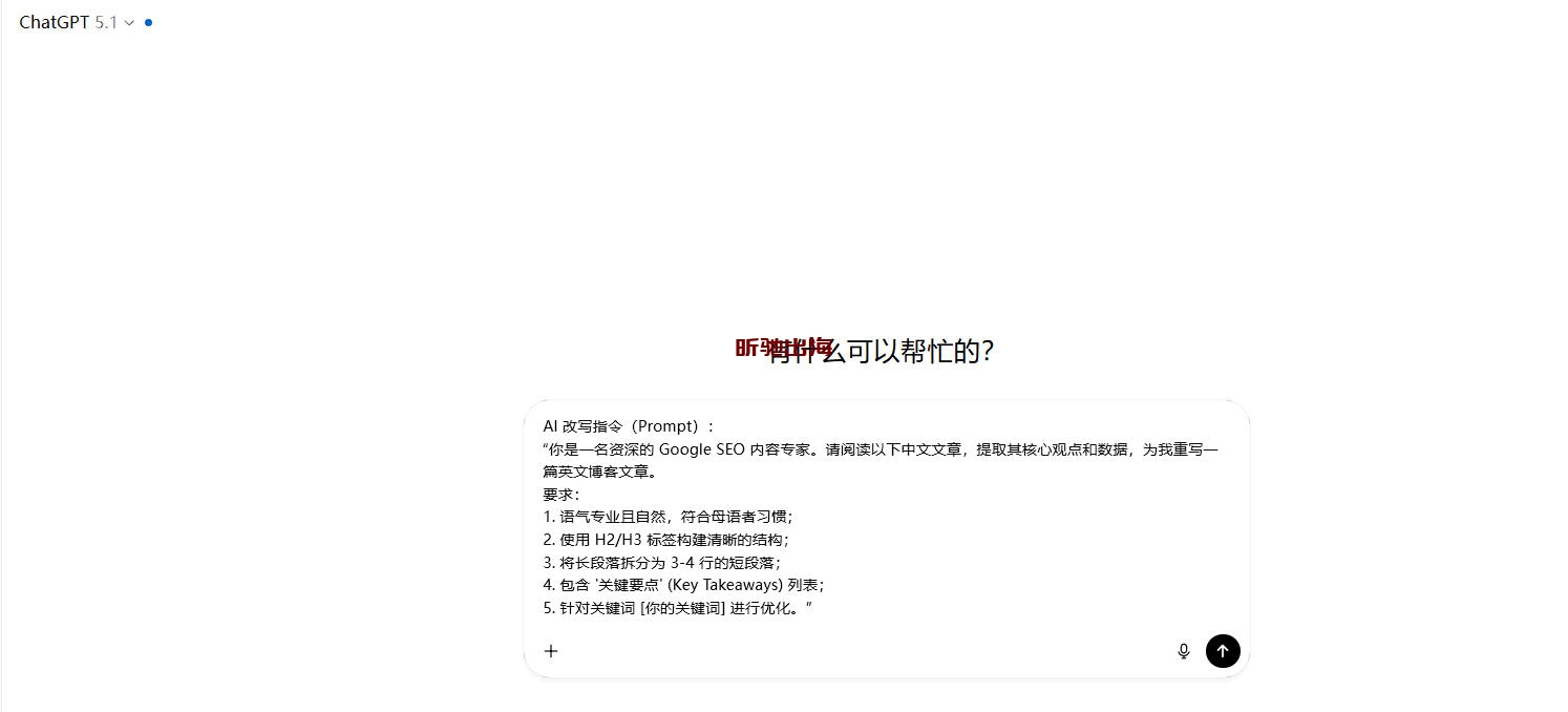 “你是一名资深的 Google SEO 内容专家。请阅读以下中文文章,提取其核心观点和数据,为我重写一篇英文博客文章。
