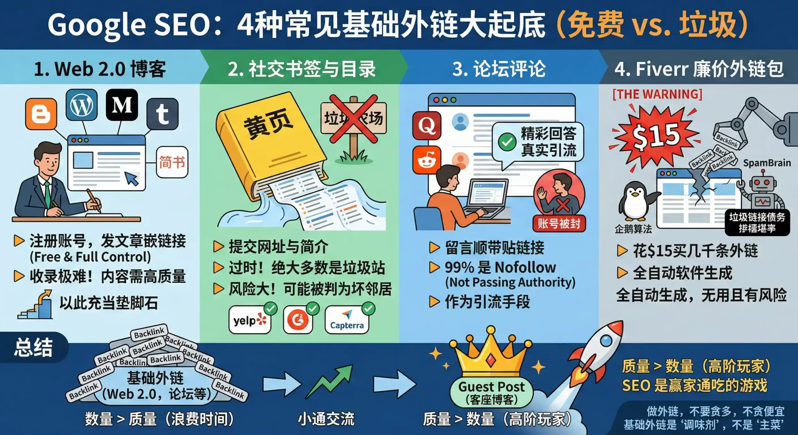 但到了中期(有流量后),请立刻停止这些低效劳动。把精力和预算全部转移到 Guest Post(客座博客) 这种高质量外链上。因为一条高质量外链,抵得上一万条垃圾基础链。
