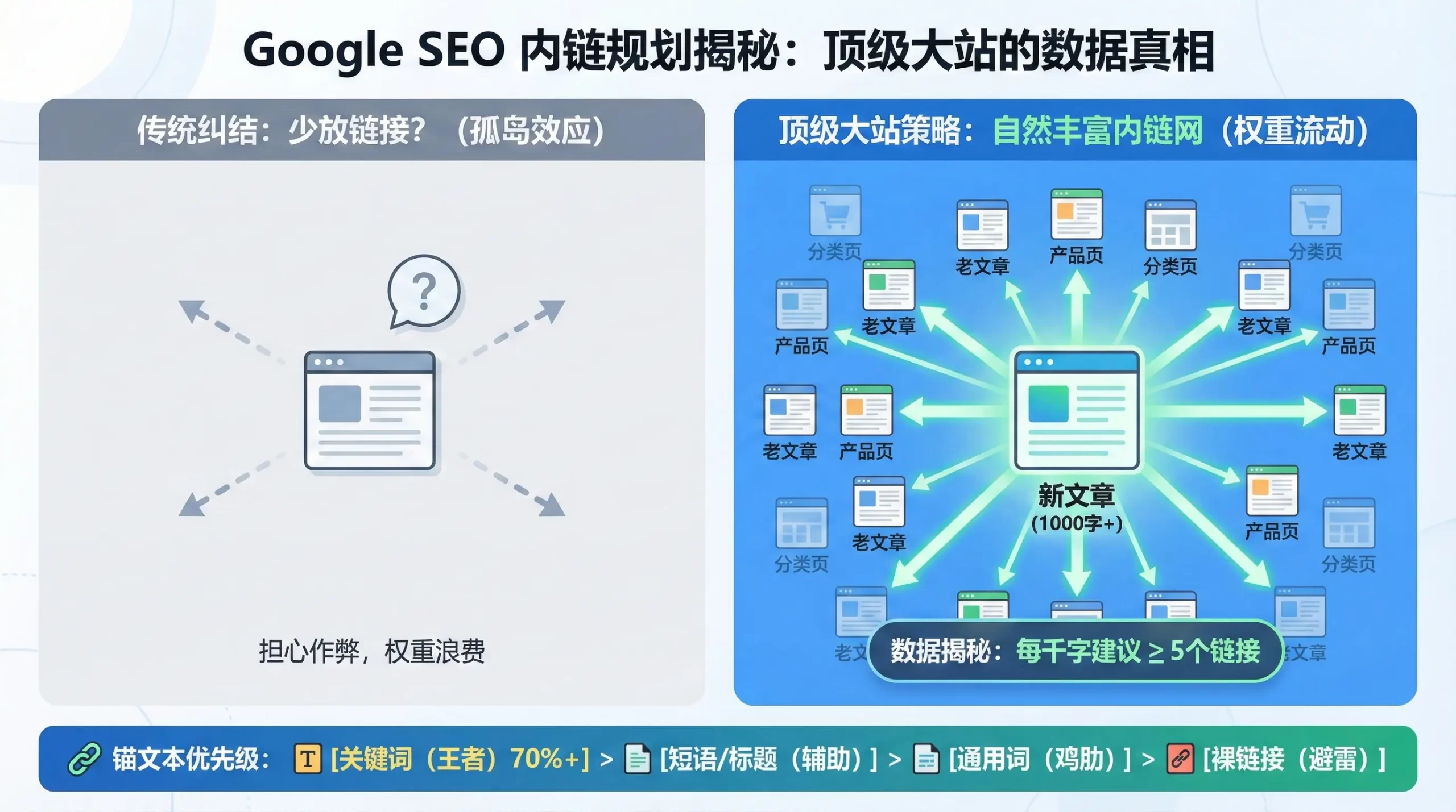 “我写了一篇 1000 字的文章,里面到底应该放几个内部链接?放多了怕被 Google 判作弊,放少了又怕权重传递不够。”