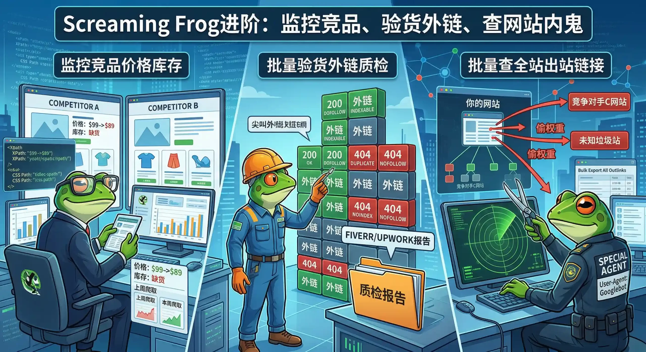 很多“一人公司”的老板觉得,爬虫工具只有程序员才用得懂。其实不然,Screaming Frog 就像一把瑞士军刀,如果你懂得善用它的“自定义提取(Custom Extraction)”和“跨站爬取”功能,它甚至能变成你的“商业间谍”。