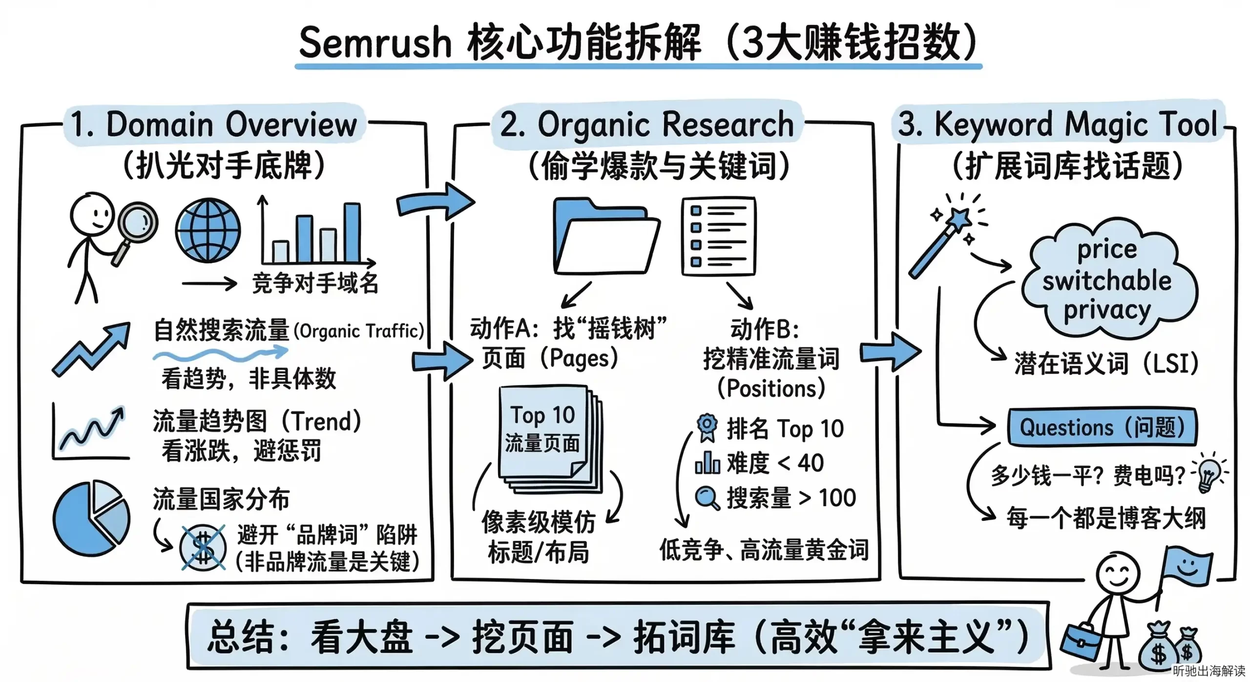 今天这篇,我就带大家把 Semrush 掰开揉碎。我们不讲那些花里胡哨的边缘功能,只聚焦能帮你赚钱的 3 大核心功能。看完这篇,你就能把竞争对手的底裤扒个精光。