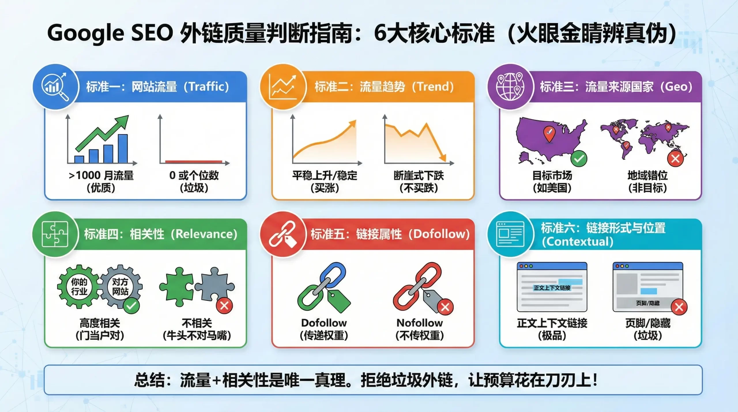 “流量 + 相关性” 才是检验外链质量的唯一真理。如果一个网站只有几百流量,但是是你的精准同行(高度相关),且流量趋势健康,那它对你来说就是高质量外链。